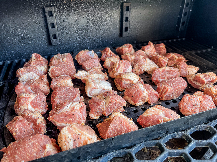 • Place pork cubes on a wire rack or perforated grill pan. Place in the smoker for 2 hours.